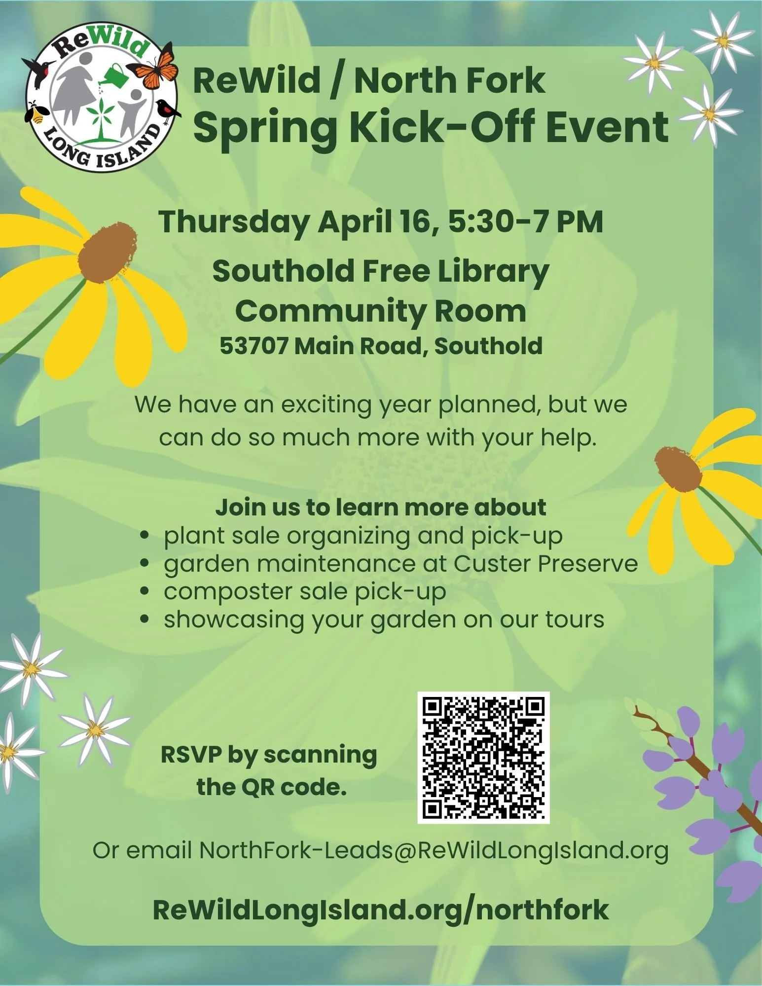 Join us for our first chapter meeting of the year at the Community Room in Southold Library (53707 Main Road) on Thursday, April 16, 5:30-7pm. Please RSVP below or email us about your availability and tell us your ideas. We have a very exciting year planned, but we can do so much more with your input and help. As we are a volunteer-led and -run community organization, we need our hardworking and committed volunteers and partners to further our causes.