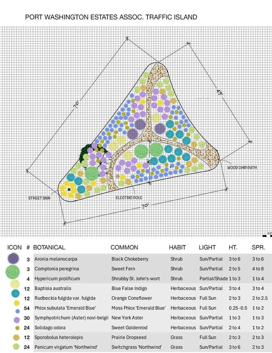Port Washington Estates (PWEA) is a home-owners organization with a limited area, yet strong interest in improving the native biodiversity and appearance of their traffic islands. These common areas have long been neglected without regard for neighborhood aesthetics. Thanks to Town Councilmember Mariann Daliamonte, they have permission to transform this space into a native garden.
